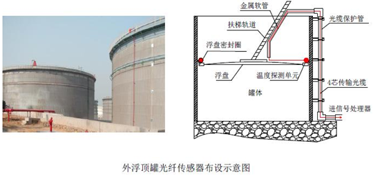 多模单芯的感温光缆安装于罐浮顶边缘的二次密封金属板和罐中间罐壁上,用铝质固定卡安装在浮船二次密封垫的固定螺栓上,呈圆周形分布,固定卡间距为1米。固定卡采用双圈交错敷设。感温光缆与传输光缆在防爆连接盒中熔接,防爆连接盒悬挂放置在喷淋管线上。