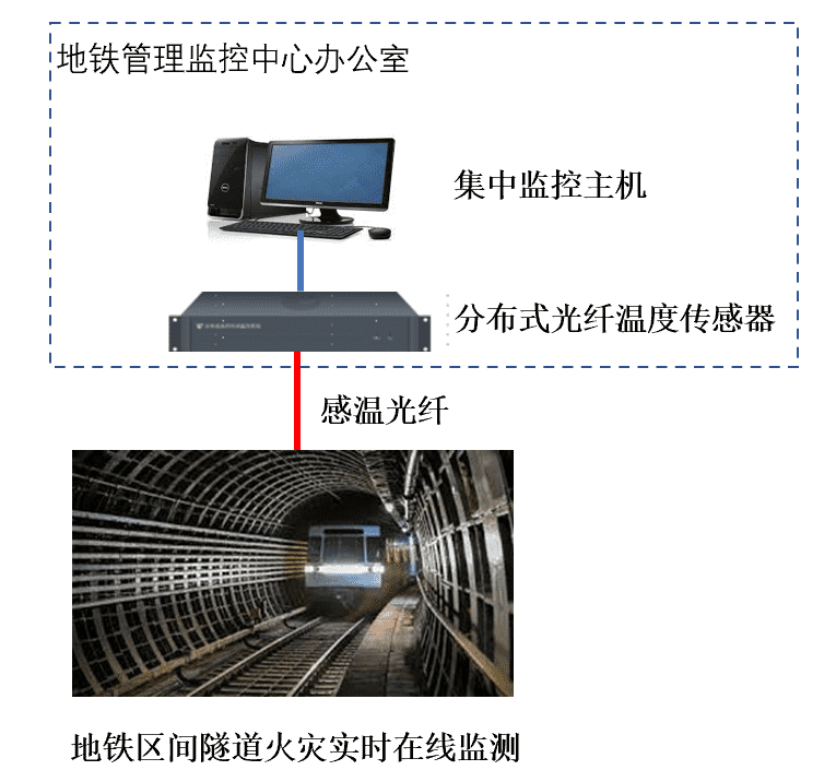 使用成都瑞莱杰森科技有限公司为地铁区间隧道定制的地铁区间隧道火灾实时在线监测系统,24小时实时在线测量地铁区间隧道温度情况,实时发现地铁区间隧道内的温度异常变化进行预防,一旦发生火灾还可以预测火焰蔓延方向,秒级通知到相关人员,也可以在监控中心的大屏上实时看到隧道温度变化情况以及火焰蔓延方向,还可以联动灭火装置,第一时间联动灭火。成都瑞莱杰森科技有限公司的地铁区间隧道火灾探测系统主要由分布式光纤温度传感器、感温光纤以及相关监控软件组成。地铁区间隧道现场只布设有一根感温光纤对地铁区间隧道沿线的温度进行监测和火灾探测,其他设备安装在地铁管理监控中心机房,整个方案安全可靠,全套系统能够很好满足地铁区间隧道火灾进行实时在线温度监测的要求,是现代消防报警的理想高科技产品。